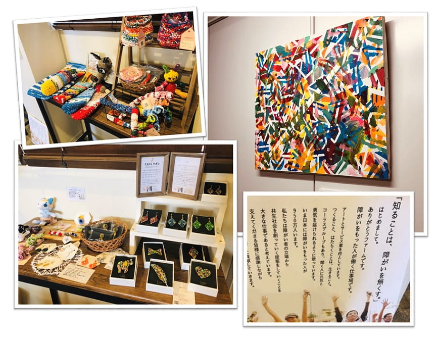 本店ショールームには、絵画展示の他にも、ありがとうファームのアーティスト制作のアクセサリーや小物も販売しておりますので、
