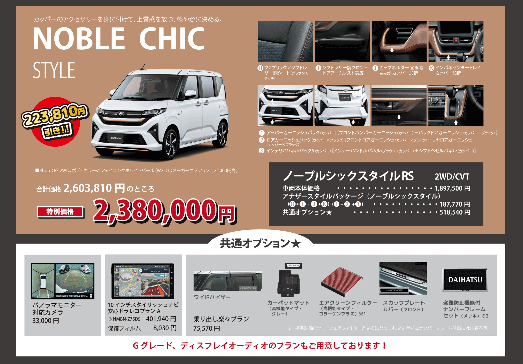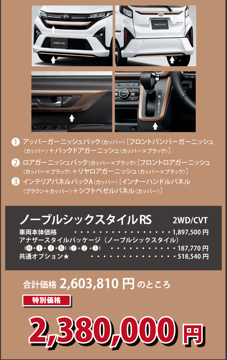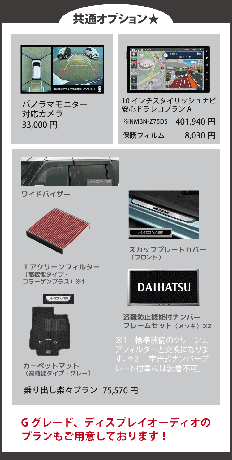 ■画像・イラストはすべてイメージです。 ■価格はすべて消費税込みです。■上記以外のメーカーオプション・ディーラーオプションは別途申し受けます。■価格には、保険料、税金(除く消費税)、登録諸費用、リサイクル料金は含まれません。■2026年1月現在の価格です。■ 乗り出し楽々プランの商品の仕様、注意事項は単品の説明に準じます。■既にご成約済みの車両にさかのぼって適用することはできません。■このキャンペーンは予告なく終了する場合がございます。■他のキャンペーンとの併用はできません。■詳しくはスタッフまでお問い合わせください。