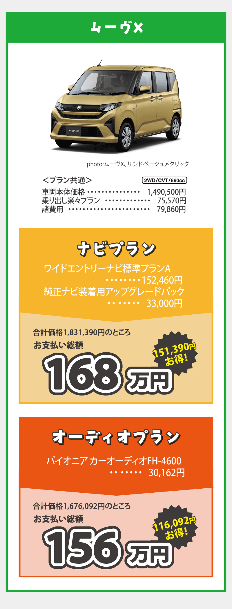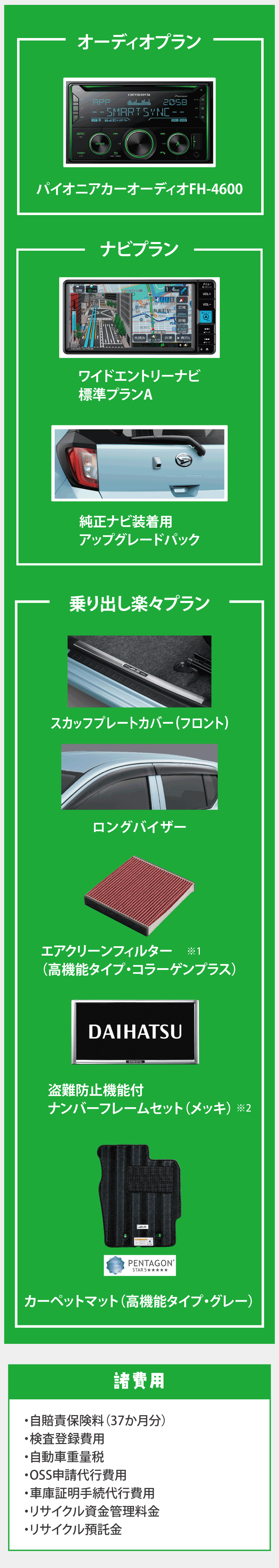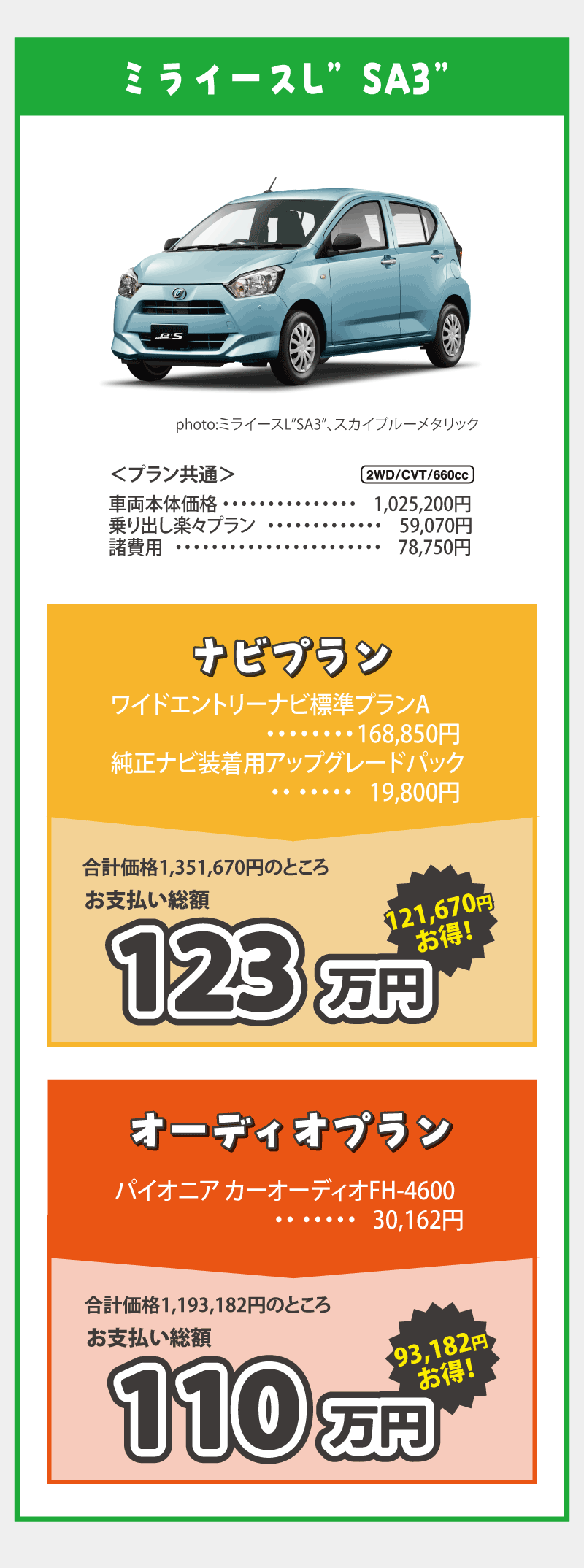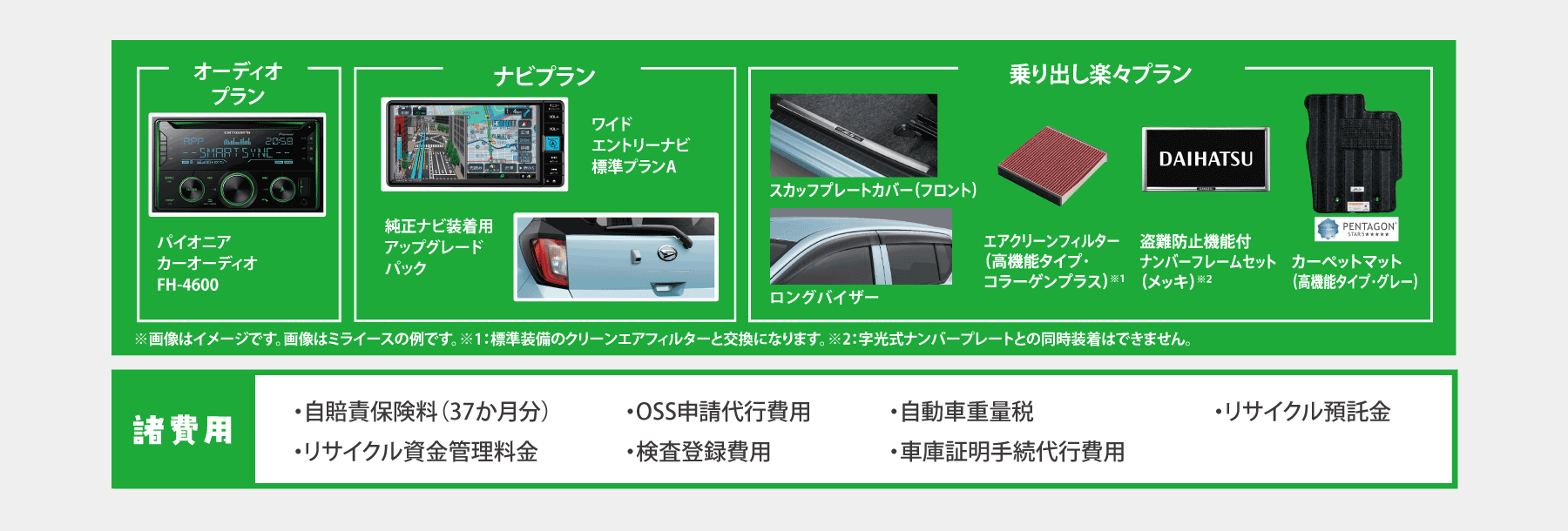 乗り出し楽々プラン…画像はミライースの例です。※1:標準装備のクリーンエアフィルターと交換になります。※2:字光式ナンバープレートとの同時装着はできません。 ■画像・イラストはすべてイメージです。 ■価格は消費税込みです。■お支払総額は2025年10月現在、県内登録(届出)、店頭納車の場合の価格です。■付属品は掲載の装備とし、上記以外のメーカーオプション・ディーラーオプションは別途申し受けます。■下取手続にかかる費用は含まれておりません。仕様の本拠の位置が車庫証明不要の場合は、車庫証明手続き費用は差し引きます。■乗り出し楽々プランの商品の仕様、注意事項は単品の説明に準じます。■既にご成約済みの車両にさかのぼって適用することはできません。■この特別仕様車は予告なく終了する場合がございます。■用品7万円分プレゼントキャンペーンとの併用はできません。■詳しくはスタッフまでお問い合わせください。