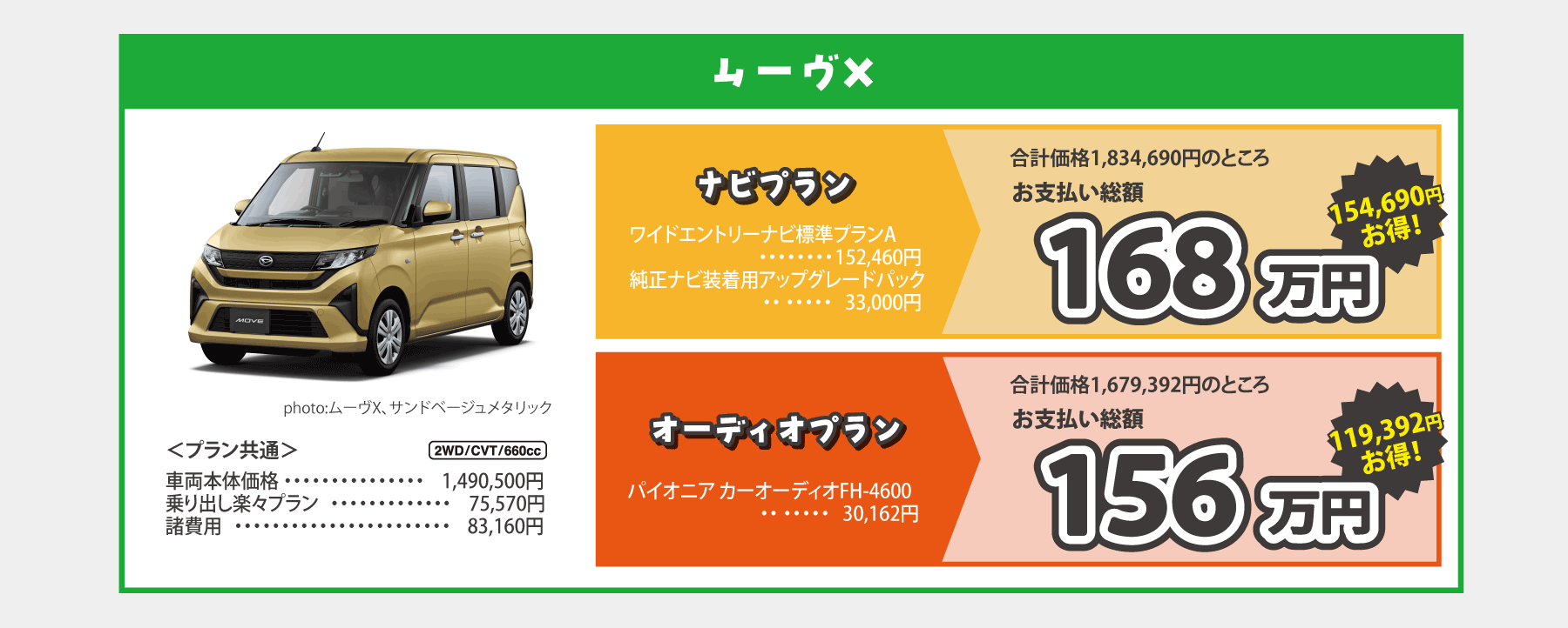 乗り出し楽々プラン…画像はミライースの例です。※1:標準装備のクリーンエアフィルターと交換になります。※2:字光式ナンバープレートとの同時装着はできません。 ■画像・イラストはすべてイメージです。 ■価格は消費税込みです。■お支払総額は2026年1月現在、県内登録(届出)、店頭納車の場合の価格です。■付属品は掲載の装備とし、上記以外のメーカーオプション・ディーラーオプションは別途申し受けます。■下取手続にかかる費用は含まれておりません。使用の本拠の位置が車庫証明不要の場合は、車庫証明手続き費用は差し引きます。■乗り出し楽々プランの商品の仕様、注意事項は単品の説明に準じます。■既にご成約済みの車両にさかのぼって適用することはできません。■この特別仕様車は予告なく終了する場合がございます。■用品プレゼントキャンペーンとの併用はできません。■詳しくはスタッフまでお問い合わせください。