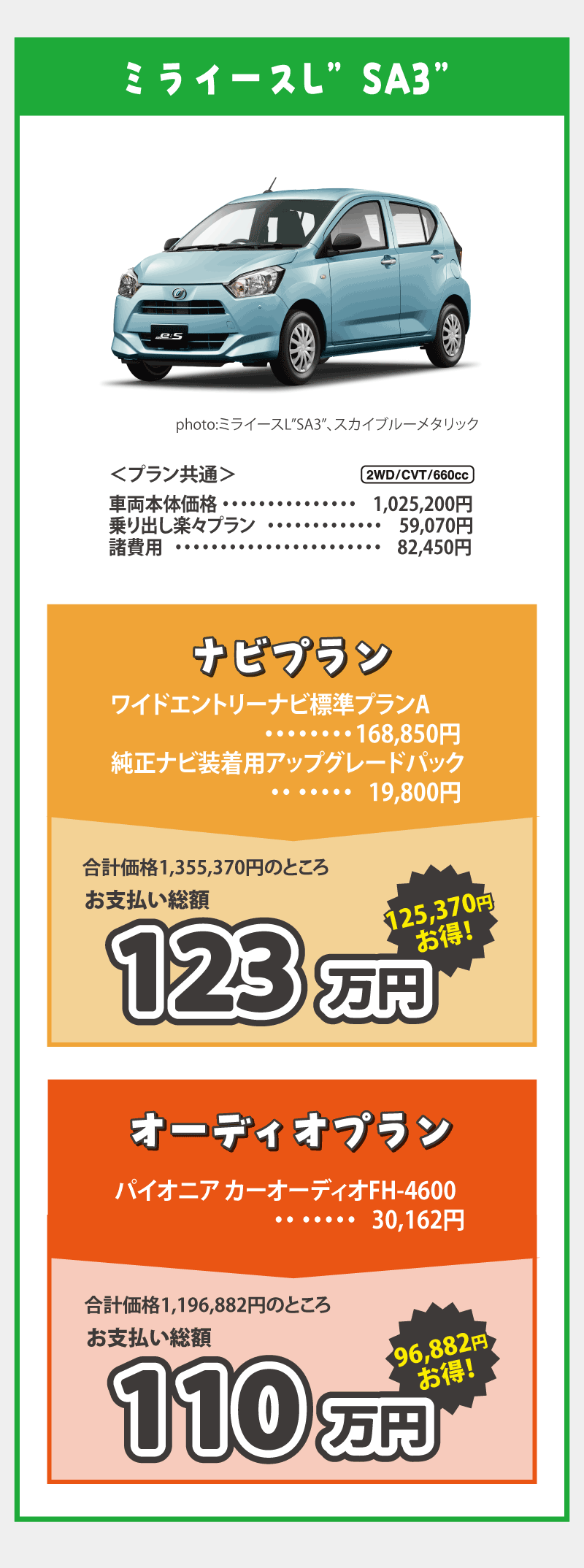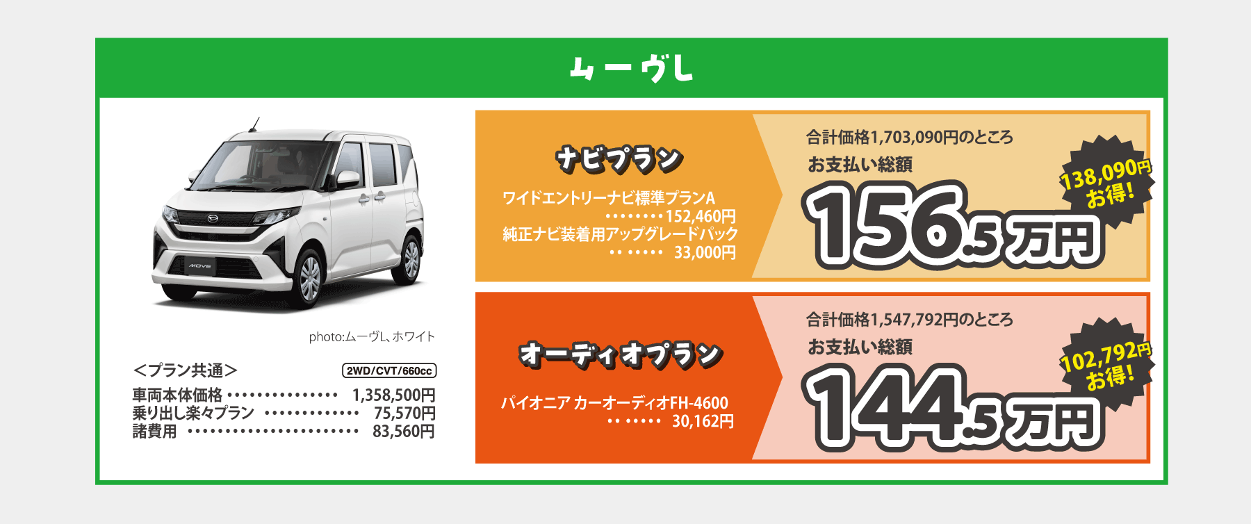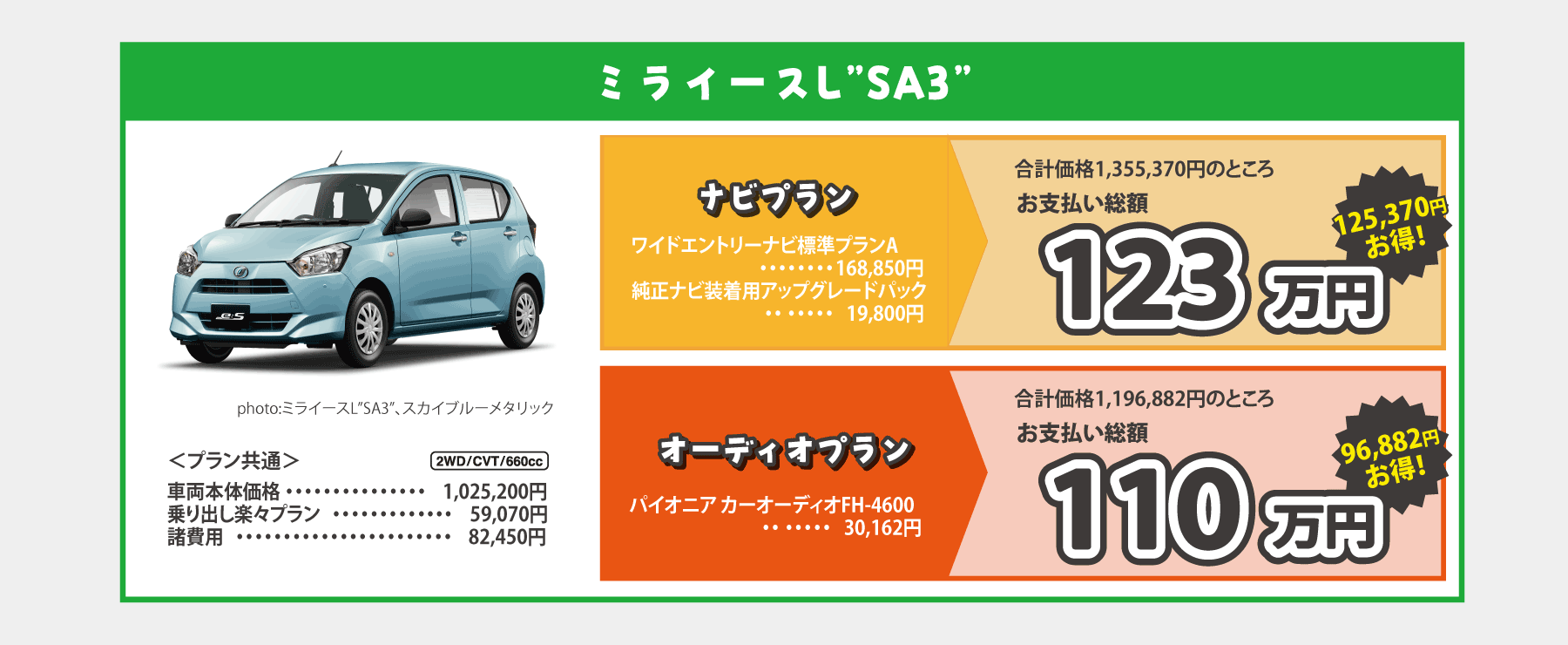 乗り出し楽々プラン…画像はミライースの例です。※1:標準装備のクリーンエアフィルターと交換になります。※2:字光式ナンバープレートとの同時装着はできません。 ■画像・イラストはすべてイメージです。 ■価格は消費税込みです。■お支払総額は2026年4月現在、県内登録(届出)、店頭納車の場合の価格です。■付属品は掲載の装備とし、上記以外のメーカーオプション・ディーラーオプションは別途申し受けます。■下取手続にかかる費用は含まれておりません。使用の本拠の位置が車庫証明不要の場合は、車庫証明手続き費用は差し引きます。■乗り出し楽々プランの商品の仕様、注意事項は単品の説明に準じます。■既にご成約済みの車両にさかのぼって適用することはできません。■この特別仕様車は予告なく終了する場合がございます。■用品プレゼントキャンペーンとの併用はできません。■詳しくはスタッフまでお問い合わせください。