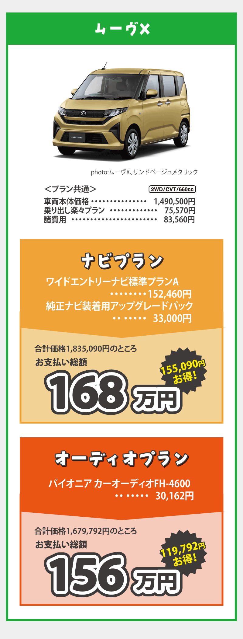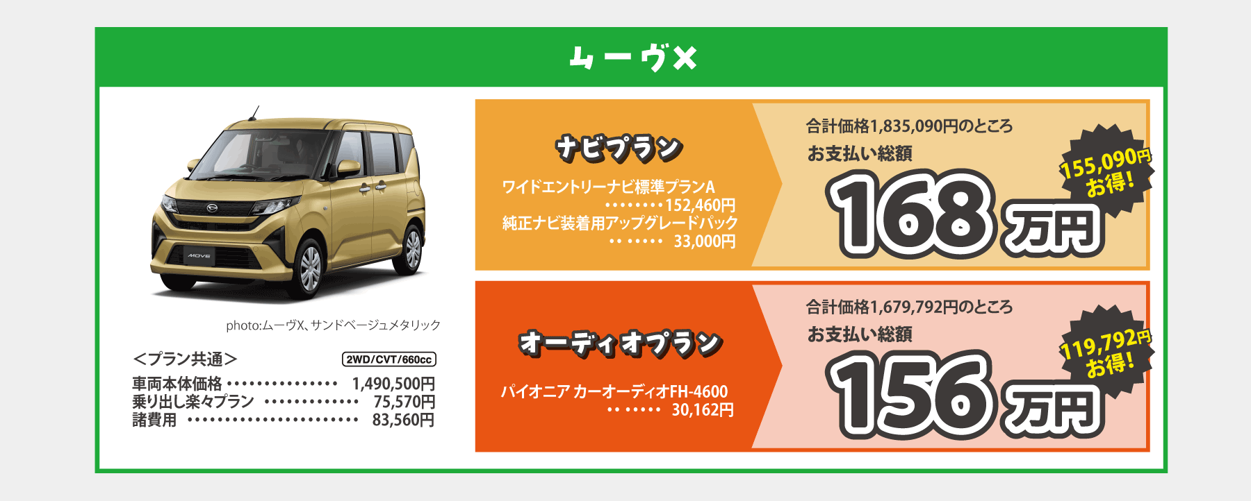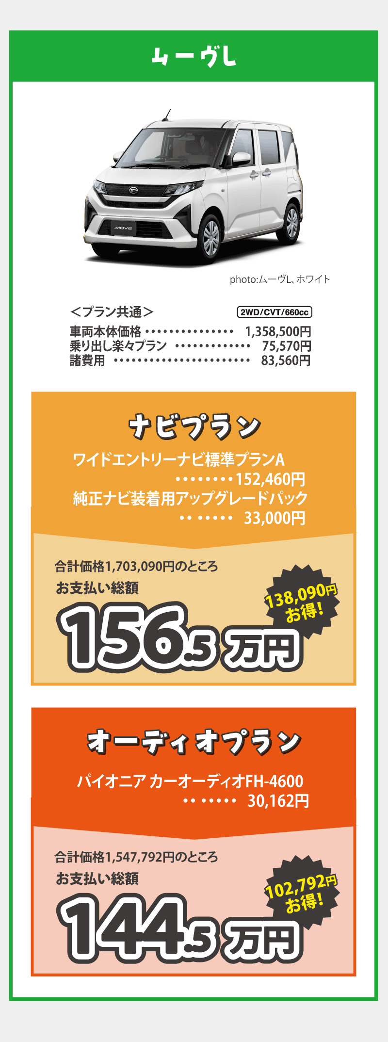 乗り出し楽々プラン…画像はミライースの例です。※1:標準装備のクリーンエアフィルターと交換になります。※2:字光式ナンバープレートとの同時装着はできません。 ■画像・イラストはすべてイメージです。 ■価格は消費税込みです。■お支払総額は2026年4月現在、県内登録(届出)、店頭納車の場合の価格です。■付属品は掲載の装備とし、上記以外のメーカーオプション・ディーラーオプションは別途申し受けます。■下取手続にかかる費用は含まれておりません。使用の本拠の位置が車庫証明不要の場合は、車庫証明手続き費用は差し引きます。■乗り出し楽々プランの商品の仕様、注意事項は単品の説明に準じます。■既にご成約済みの車両にさかのぼって適用することはできません。■この特別仕様車は予告なく終了する場合がございます。■用品プレゼントキャンペーンとの併用はできません。■詳しくはスタッフまでお問い合わせください。