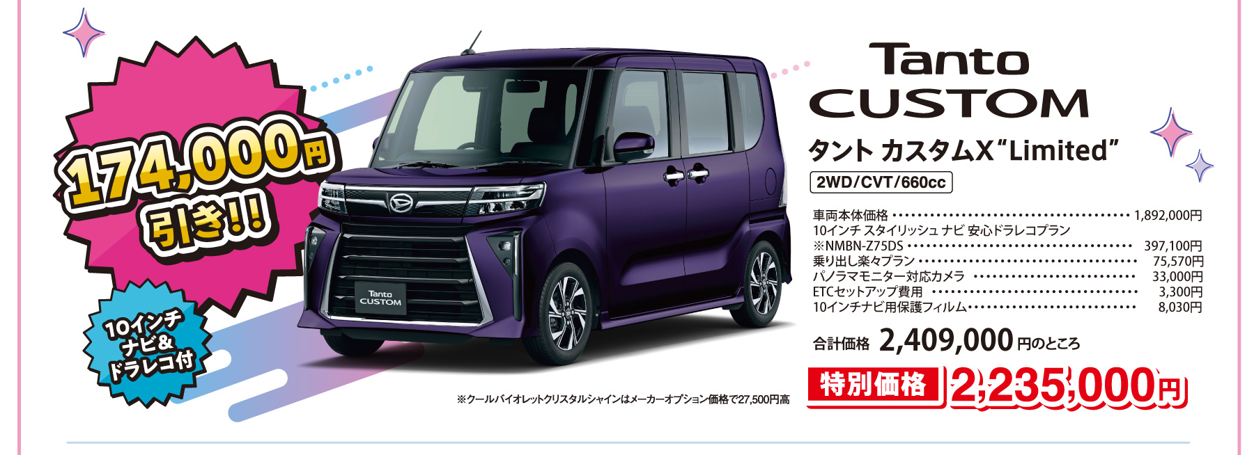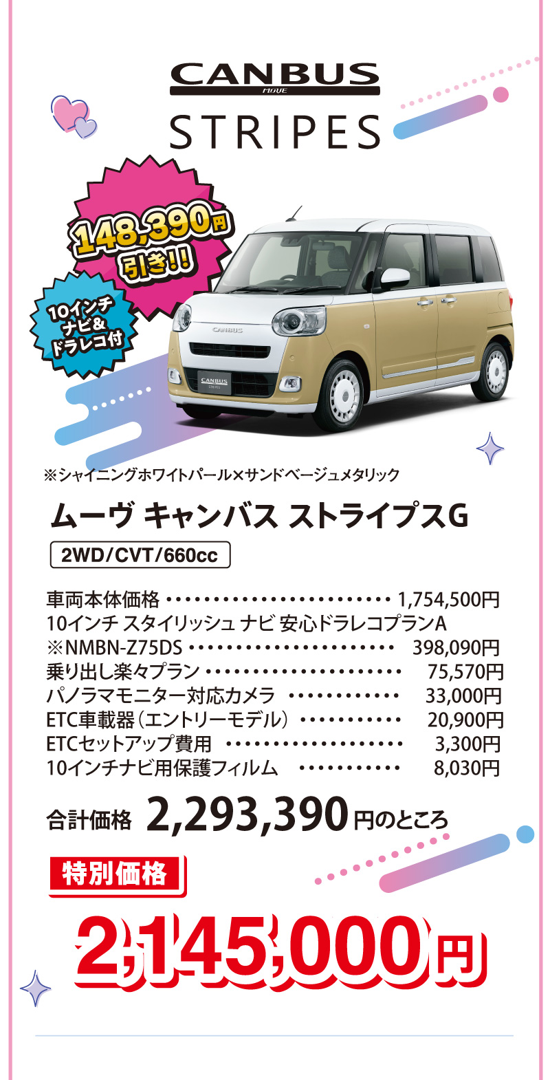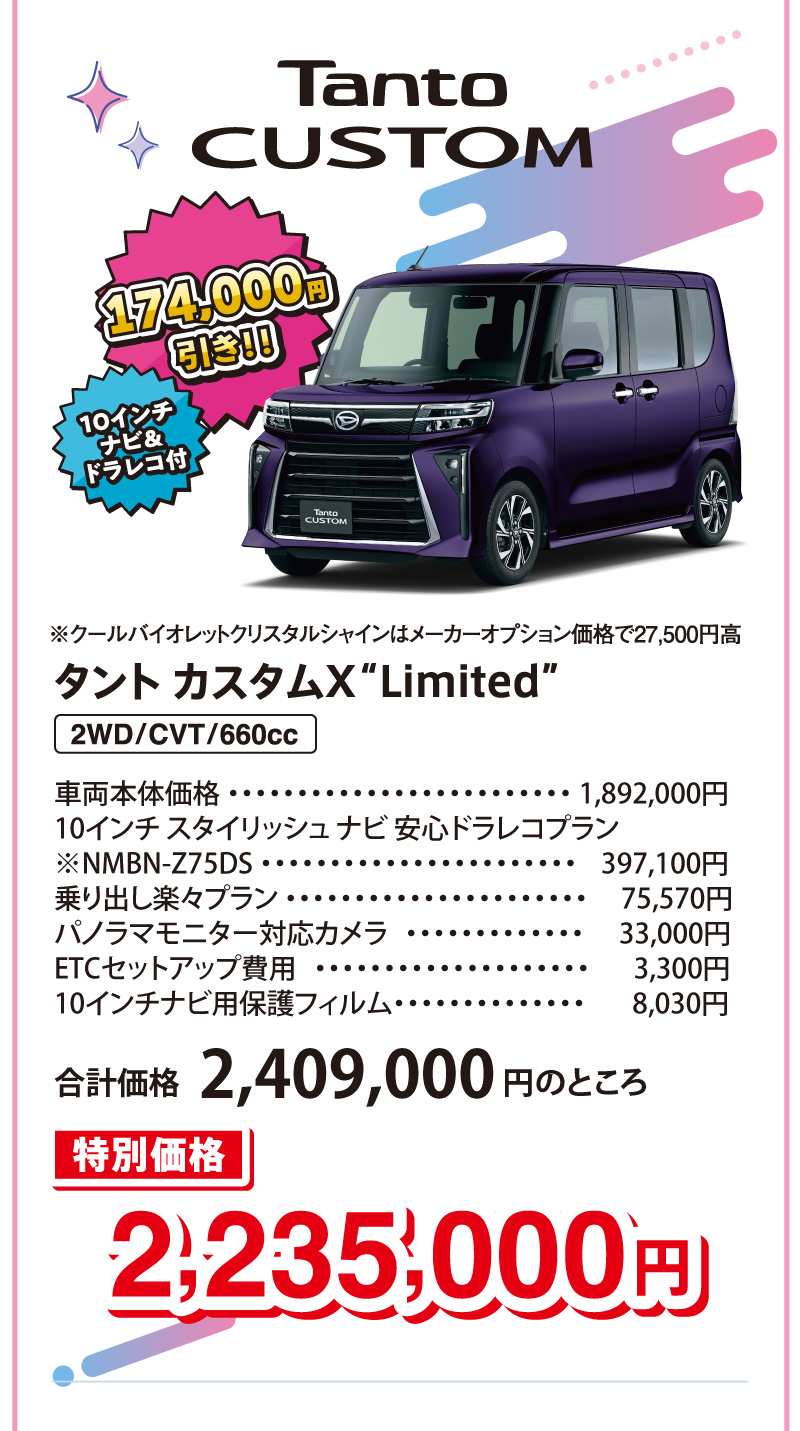 ■画像・イラストはすべてイメージです。 ■価格はすべて消費税込みです。■上記以外のメーカーオプション・ディーラーオプションは別途申し受けます。■価格には、保険料、税金(除く消費税)、登録諸費用、リサイクル料金は含まれません。■2026年1月現在の価格です。■ 乗り出し楽々プランの商品の仕様、注意事項は単品の説明に準じます。■既にご成約済みの車両にさかのぼって適用することはできません。■このキャンペーンは予告なく終了する場合がございます。■他のキャンペーンとの併用はできません。■詳しくはスタッフまでお問い合わせください。
