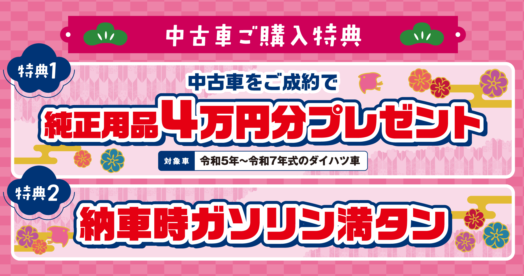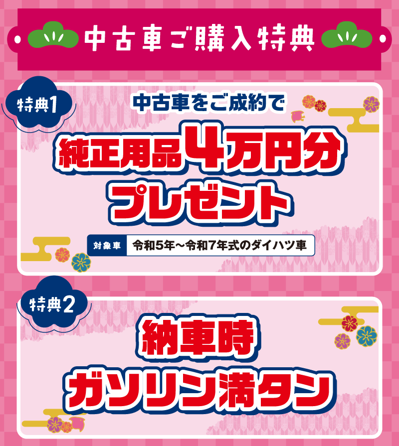 【特典1・2】■特典1と2は併用できます。■岡山ダイハツ直営14店舗のみ有効です。■既にご成約済みの車両に遡って適用することはできません。■このキャンペーンは予告なく終了する場合がございます。ご了承ください。■詳しくはスタッフまでお問い合わせください。【特典1】…■2025年12月6日〜12月21日までに中古車と純正用品をセットでご成約いただくと、最大40,000円(取付費・税込)割引いたします。純正用品の合計が40,000円(取付費・税込)に満たない場合は、純正用品の合計額を上限として割引いたします。■令和5年~令和7年式のダイハツ車に限ります。【特典2】…■2025年12月6日~12月21日に中古車をご成約いただいた場合、ガソリン満タンでご納車いたします。