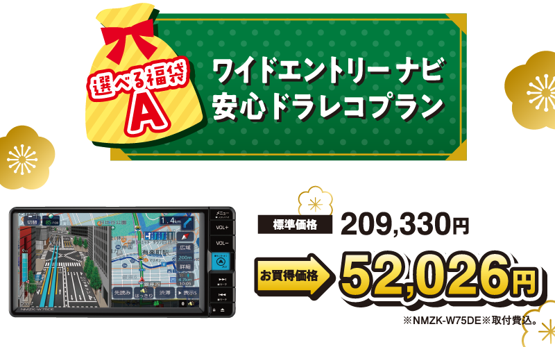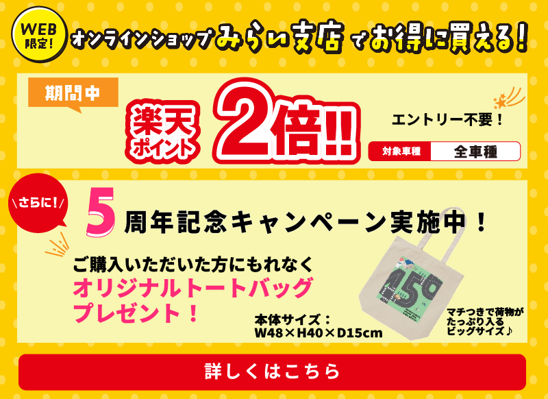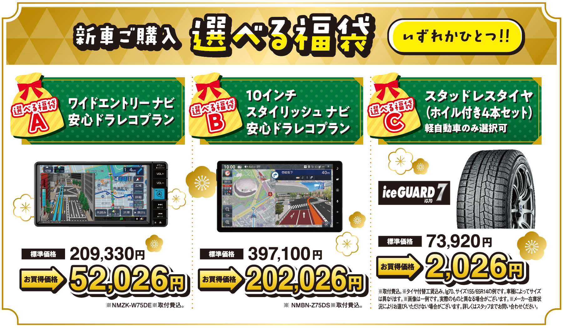 ※掲載の標準価格・画像はタントXの例です。※ダイハツの新車をご成約の上、同時装着に限ります。※福袋は特別仕様車との重複利用はできません。※福袋A、Bは他のキャンペーンとの併用はできません。※福袋Cは軽自動車のみご選択いただけます。※新車ご購入選べる福袋A、B、Cの併用はできません。ご了承ください。※コペンは福袋A、B、Cの対象外です。※ハイゼットトラック、ハイゼットカーゴは福袋A、Bの対象外です。※みらい支店でご購入の際はご利用いただけません。※既にご成約済みの車両に遡って適用することはできません。※このキャンペーンは予告なく終了する場合がございます。※詳しくはスタッフまでお問い合わせください。