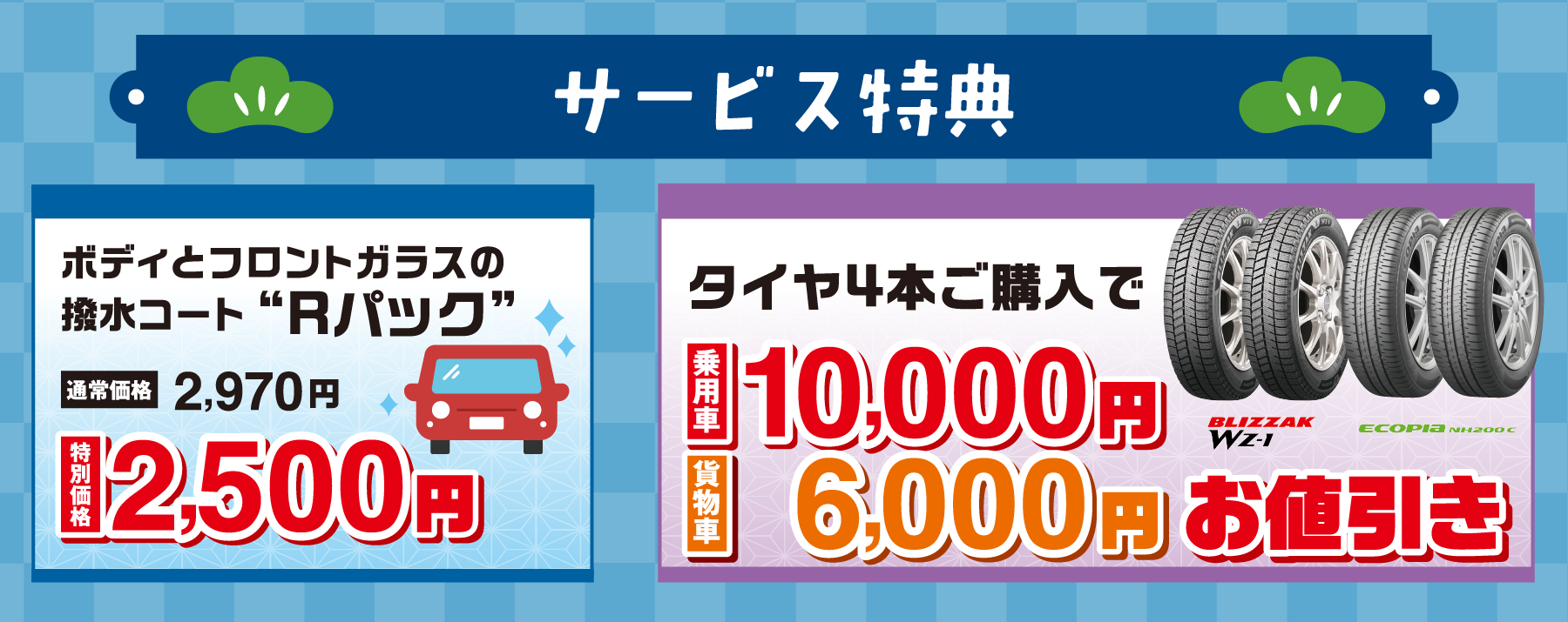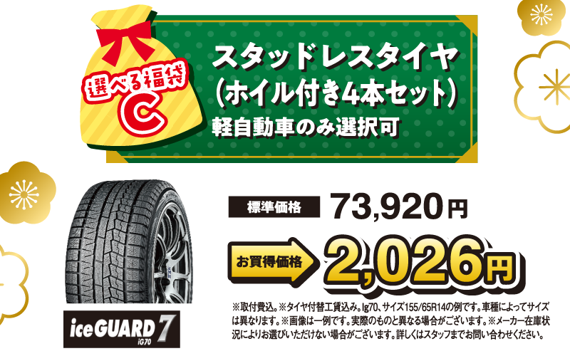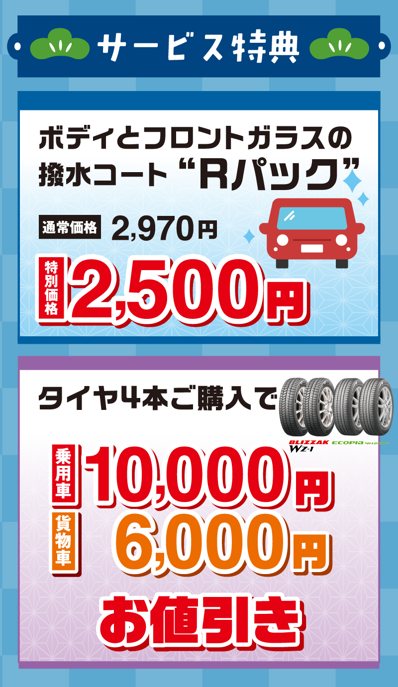 ■ワンダフルパスポート特典とは併用できません。■Rパック…ご予約の上、2025年12月6日~12月21日に作業をさせていただくことを条件に、特別価格2,500円(税込)を適用いたします。■タイヤ…タイヤ4本をセットでご購入いただき、2025年12月1日~2026年1月31日に岡山ダイハツで取付作業をさせていただくことを条件に、通常販売価格より、乗用車10,000円(税込)、貨物車6,000円(税込)お値引きいたします。