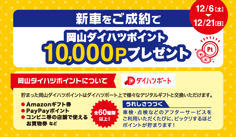 ■2025年12月6日~12月21日までに新車をご成約いただくと、ダイハツポイント10,000ポイントをプレゼントいたします。/岡山ダイハツポイントについて…*記載の内容は2025年11月時点の内容です。*本サービスのご利用には予めダイハツポートへの会員登録が必要です。*登録料・年会費は無料です。*ポイントはダイハツポート上で様々な商品・サービスと交換いただけます。*ポイントの有効期限はそれぞれ発行日から2年後の月末です。*過去のご利用実績に遡って付与はできません。*ポイントの他人への貸与や譲渡、及び残高の換金、並びに会員様間でのポイントの合算・移行はできません。*スマートフォンの機種や通信環境等によってご利用いただけない場合がございます。*交換ポイント数、及び付与内容は都合により予告なく変更・中止する場合がございます。*本サービスは会員規約に基づきご提供するものといたします。*会員規約はダイハツポートにログイン後ご確認いただけます。*詳しくは岡山ダイハツホームページをご確認ください。※岡山ダイハツ直営14店舗のみ有効です。 ■既にご成約済みの車両に遡って適用することはできません。■このキャンペーンは予告なく終了する場合がございます。■詳しくはスタッフまでお問い合わせください。