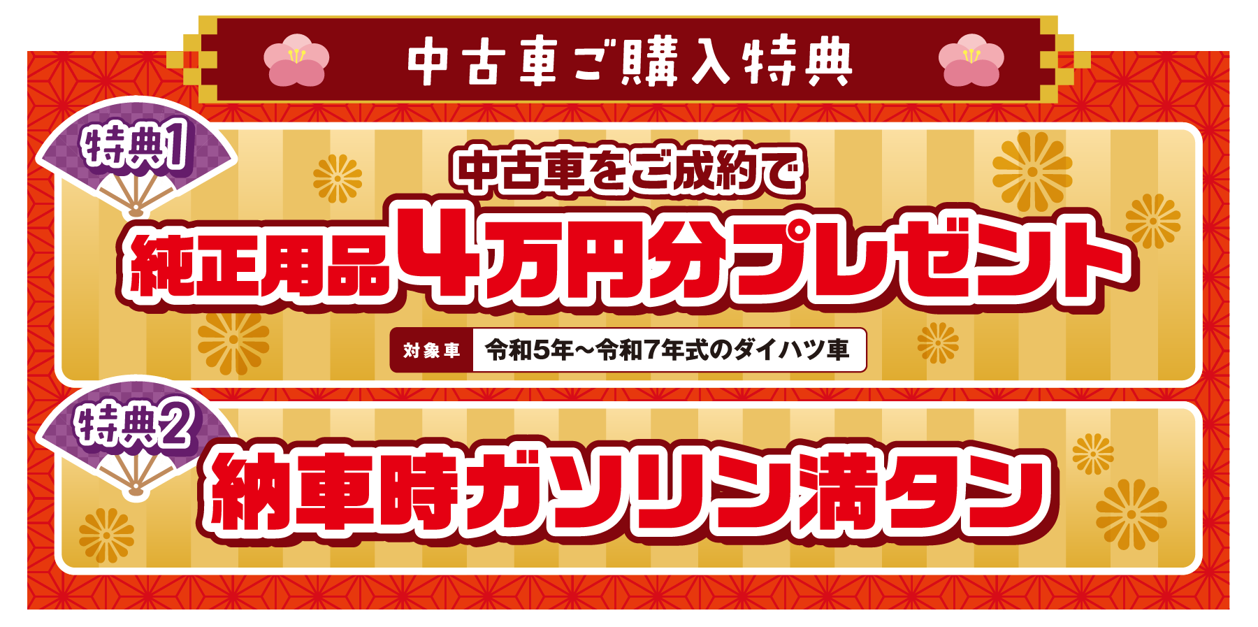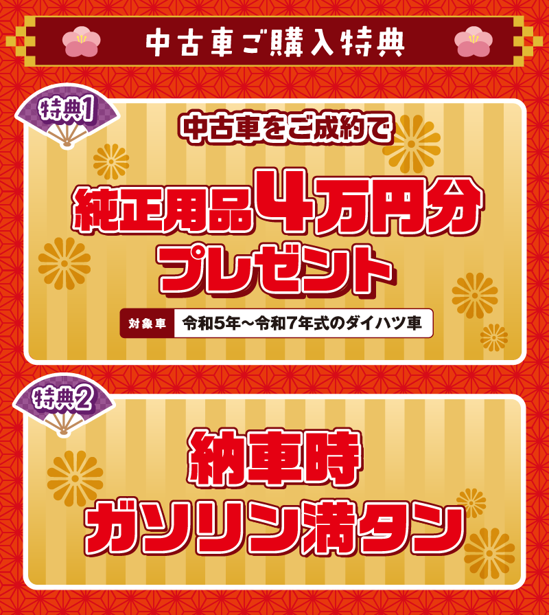【特典1・2】■特典1と2は併用できます。■岡山ダイハツ直営14店舗のみ有効です。■既にご成約済みの車両に遡って適用することはできません。■このキャンペーンは予告なく終了する場合がございます。ご了承ください。■詳しくはスタッフまでお問い合わせください。【特典1】…■2026年1月4日〜1月12日までに中古車と純正用品をセットでご成約いただくと、最大40,000円(取付費・税込)割引いたします。純正用品の合計が40,000円(取付費・税込)に満たない場合は、純正用品の合計額を上限として割引いたします。■令和5年~令和7年式のダイハツ車に限ります。【特典2】…■2026年1月4日~1月12日に中古車をご成約いただいた場合、ガソリン満タンでご納車いたします。