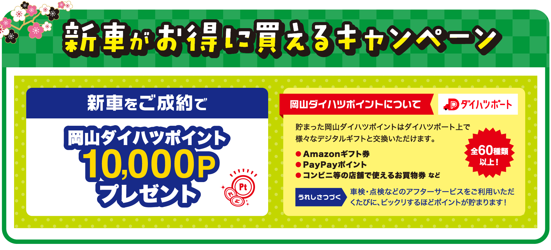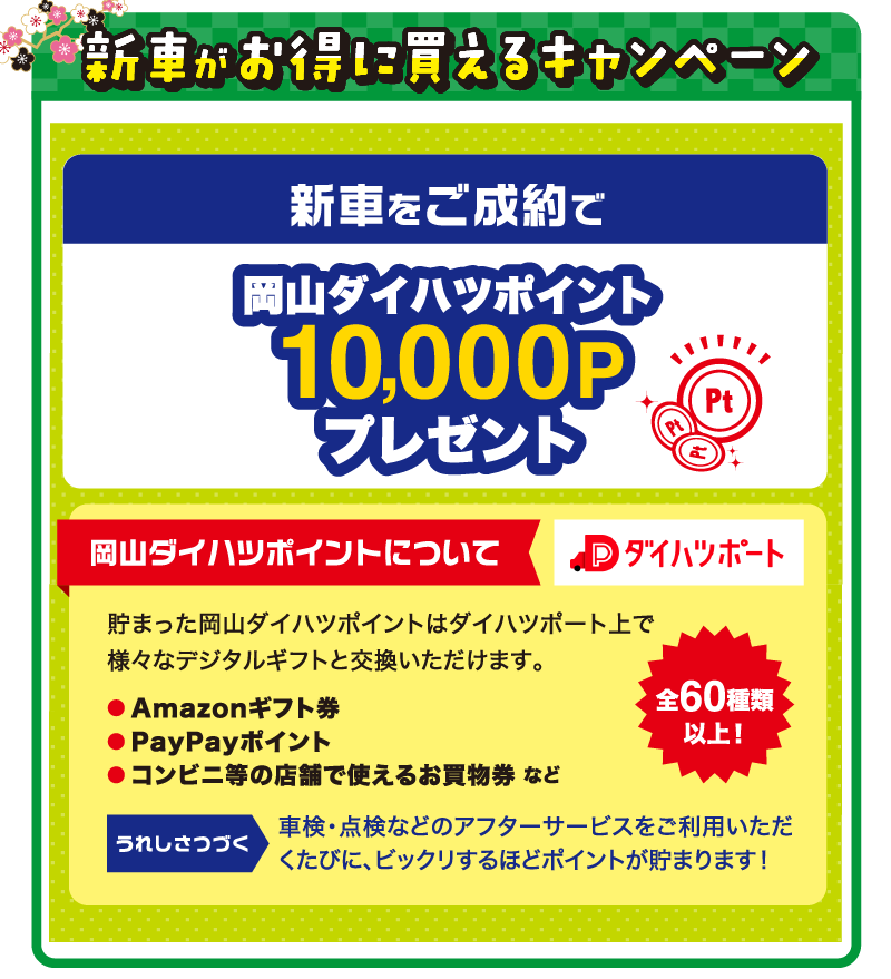 ■2026年1月4日~1月12日までに新車をご成約いただくと、ダイハツポイント10,000ポイントをプレゼントいたします。/岡山ダイハツポイントについて…*記載の内容は2025年12月時点の内容です。*本サービスのご利用には予めダイハツポートへの会員登録が必要です。*登録料・年会費は無料です。*ポイントはダイハツポート上で様々な商品・サービスと交換いただけます。*ポイントの有効期限はそれぞれ発行日から2年後の月末です。*過去のご利用実績に遡って付与はできません。*ポイントの他人への貸与や譲渡、及び残高の換金、並びに会員様間でのポイントの合算・移行はできません。*スマートフォンの機種や通信環境等によってご利用いただけない場合がございます。*交換ポイント数、及び付与内容は都合により予告なく変更・中止する場合がございます。*本サービスは会員規約に基づきご提供するものといたします。*会員規約はダイハツポートにログイン後ご確認いただけます。*詳しくは 岡山ダイハツホームページをご確認ください。※岡山ダイハツ直営14店舗のみ有効です。 ■既にご成約済みの車両に遡って適用することはできません。■このキャンペーンは予告なく終了する場合がございます。■詳しくはスタッフまでお問い合わせください。