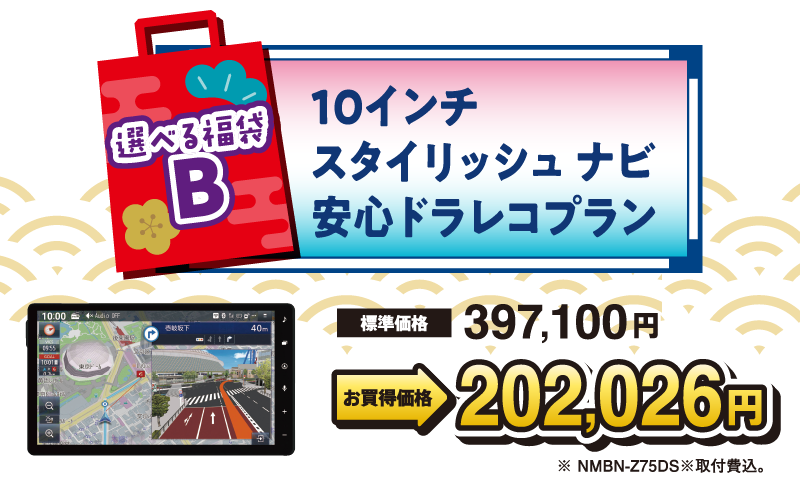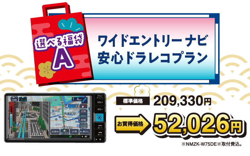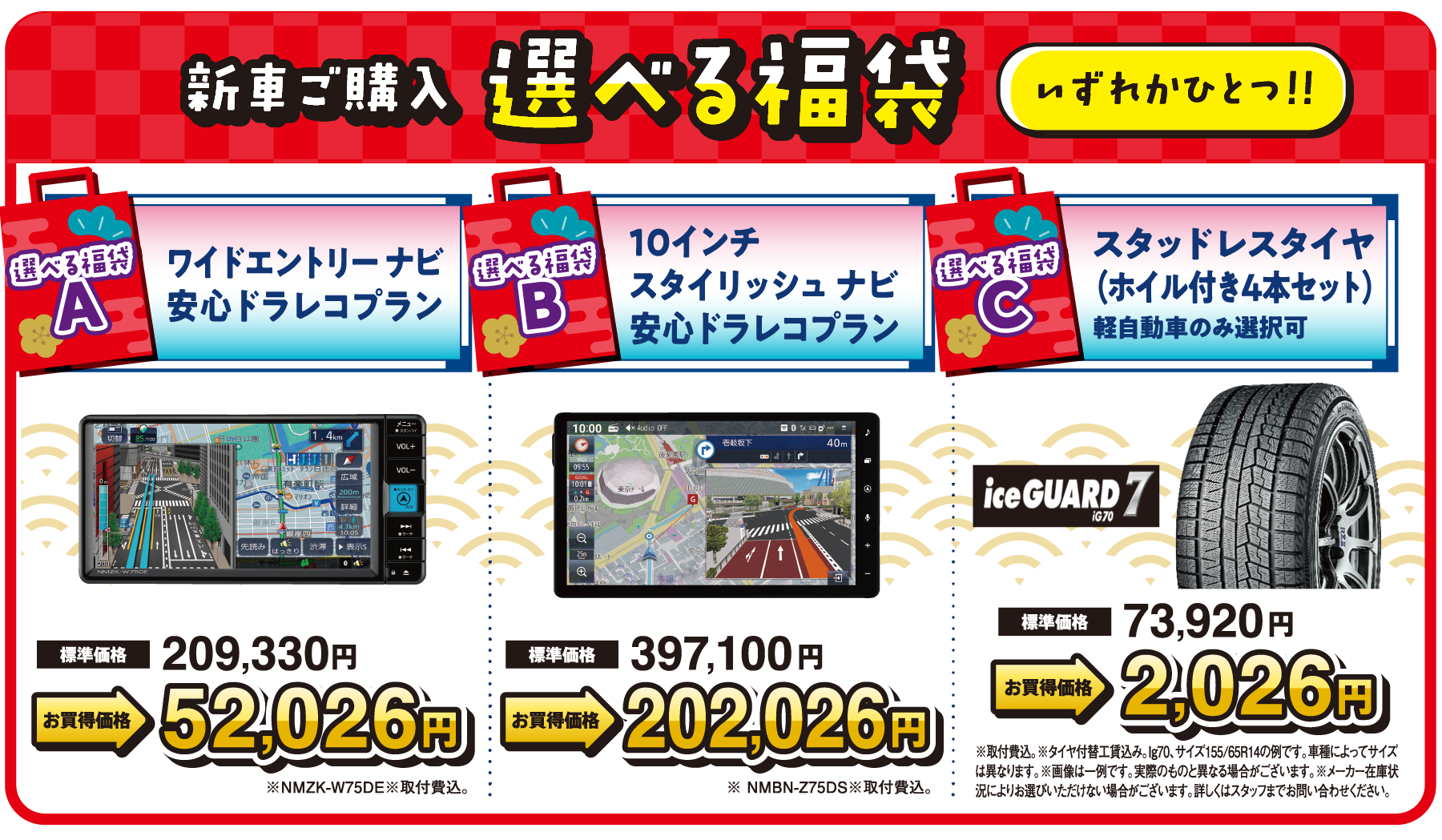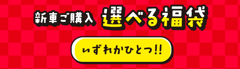 ※掲載の標準価格・画像はタントXの例です。※ダイハツの新車をご成約の上、同時装着に限ります。※福袋は特別仕様車との重複利用はできません。※福袋A、Bは他のキャンペーンとの併用はできません。※福袋Cは軽自動車のみご選択いただけます。※新車ご購入選べる福袋A、B、Cの併用はできません。ご了承ください。※コペンは福袋A、B、Cの対象外です。※ハイゼットトラック、ハイゼットカーゴは福袋A、Bの対象外です。※みらい支店でご購入の際はご利用いただけません。※既にご成約済みの車両に遡って適用することはできません。※このキャンペーンは予告なく終了する場合がございます。※詳しくはスタッフまでお問い合わせください。