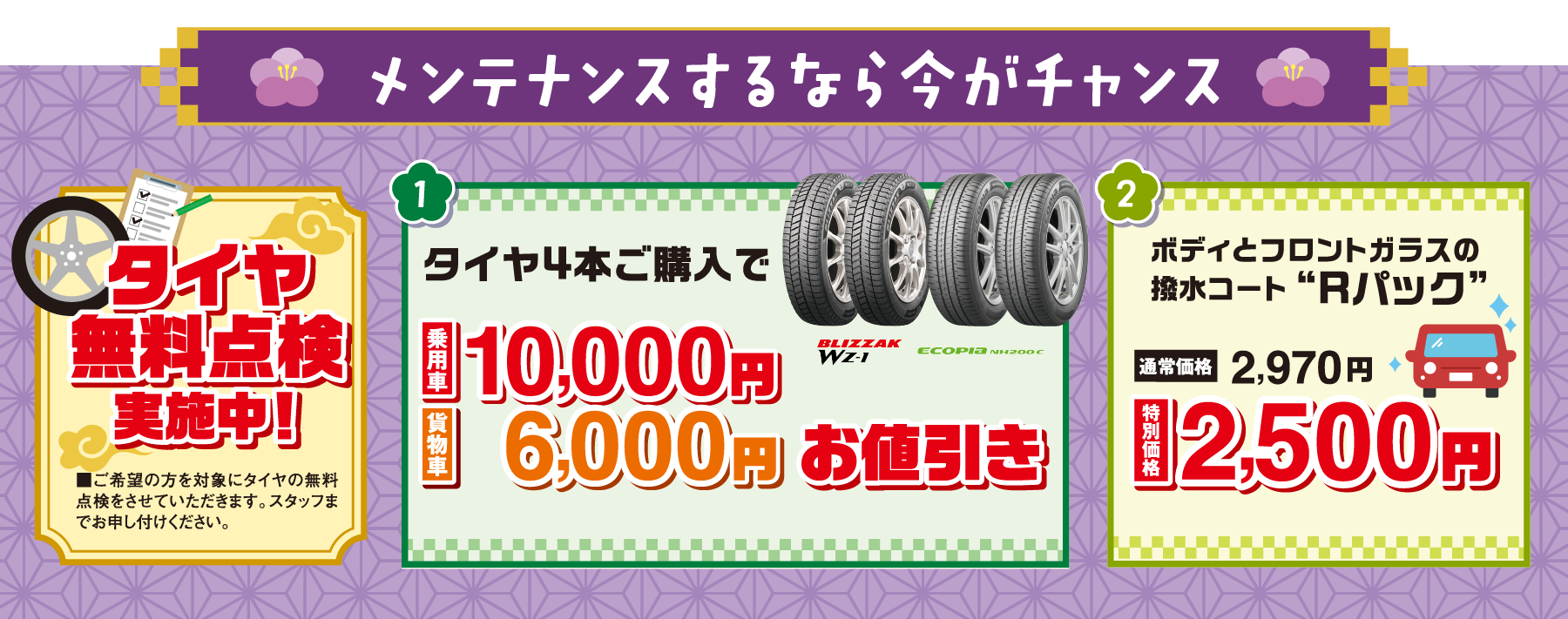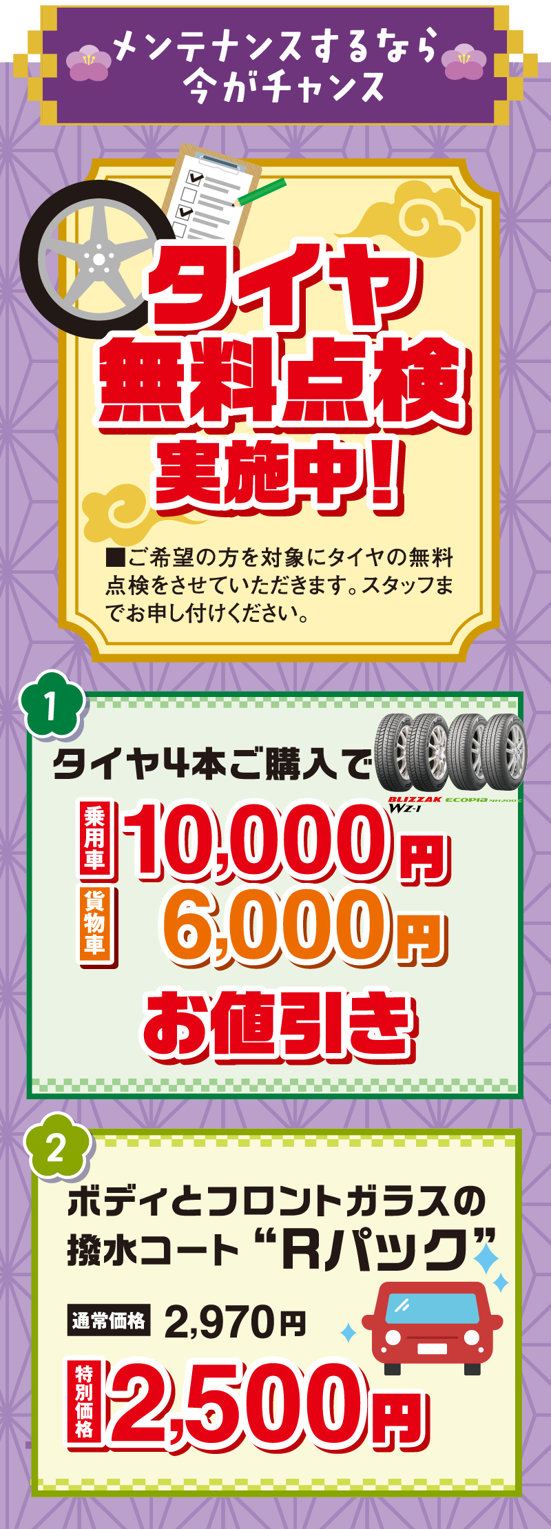 ■タイヤ…タイヤ4本をセットでご購入いただき、2025年12月1日~2026年1月31日に岡山ダイハツで取付作業をさせていただくことを条件に、通常販売価格より、乗用車10,000円(税込)、貨物車6,000円(税込)お値引きいたします。ワンダフルパスポート特典とは併用できません。■Rパック…ご予約の上、2026年1月4日~1月12日に作業をさせていただくことを条件に、特別価格2,500円(税込)を適用いたします。ワンダフルパスポート特典とは併用できません。